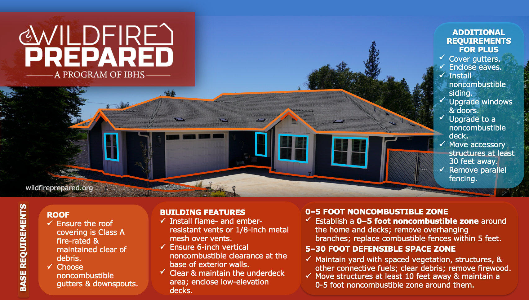 Click here for a more detailed look at all material requirements across the CA WUI Part 7, Wildfire Prepared Home Base, and Wildfire Prepared Home Plus standards.